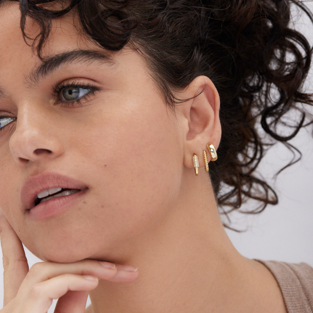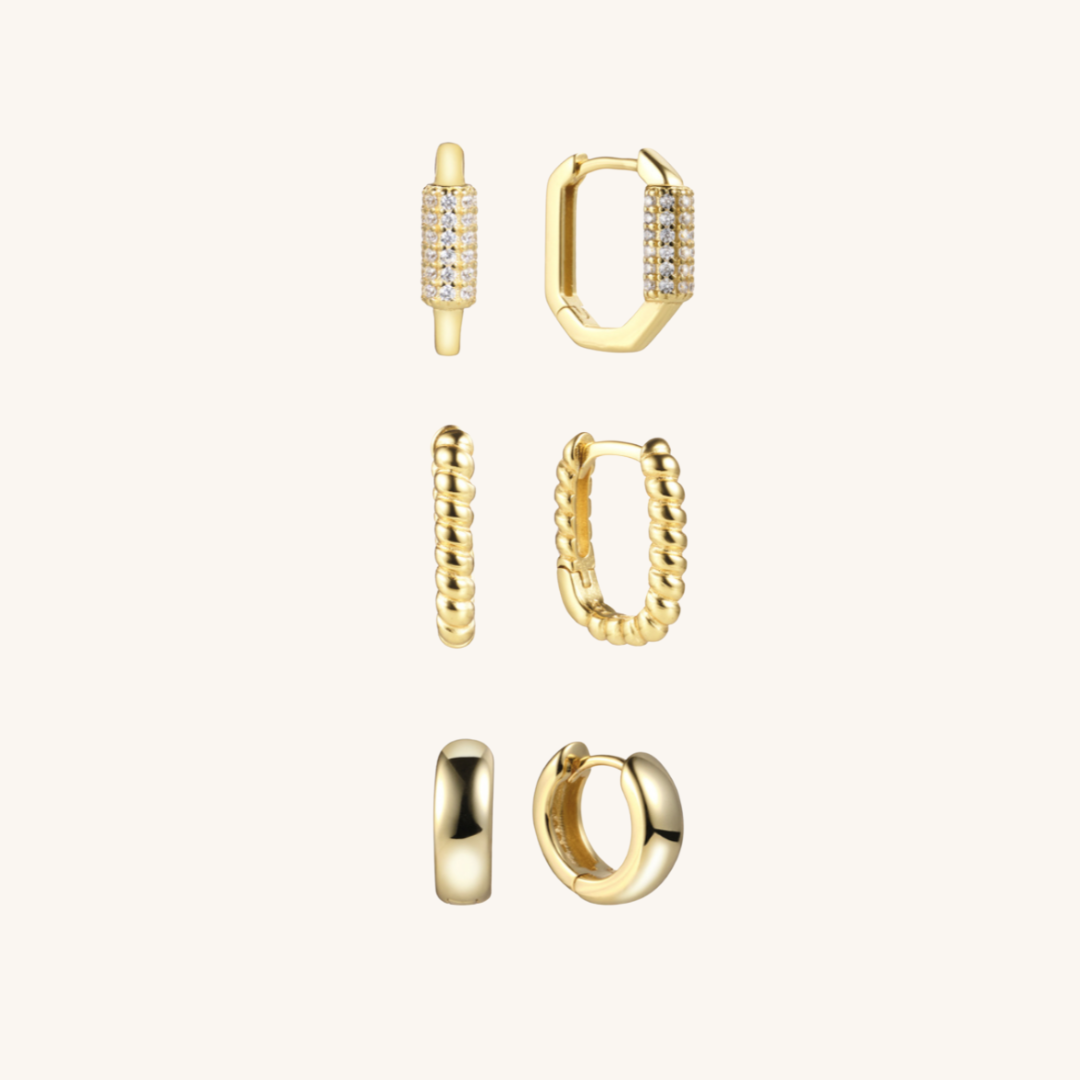 We've curated the PERFECT ear stack. The Huggie Stack Pack (Gold) comes with 3 pairs of earrings, including:
