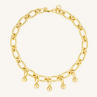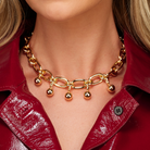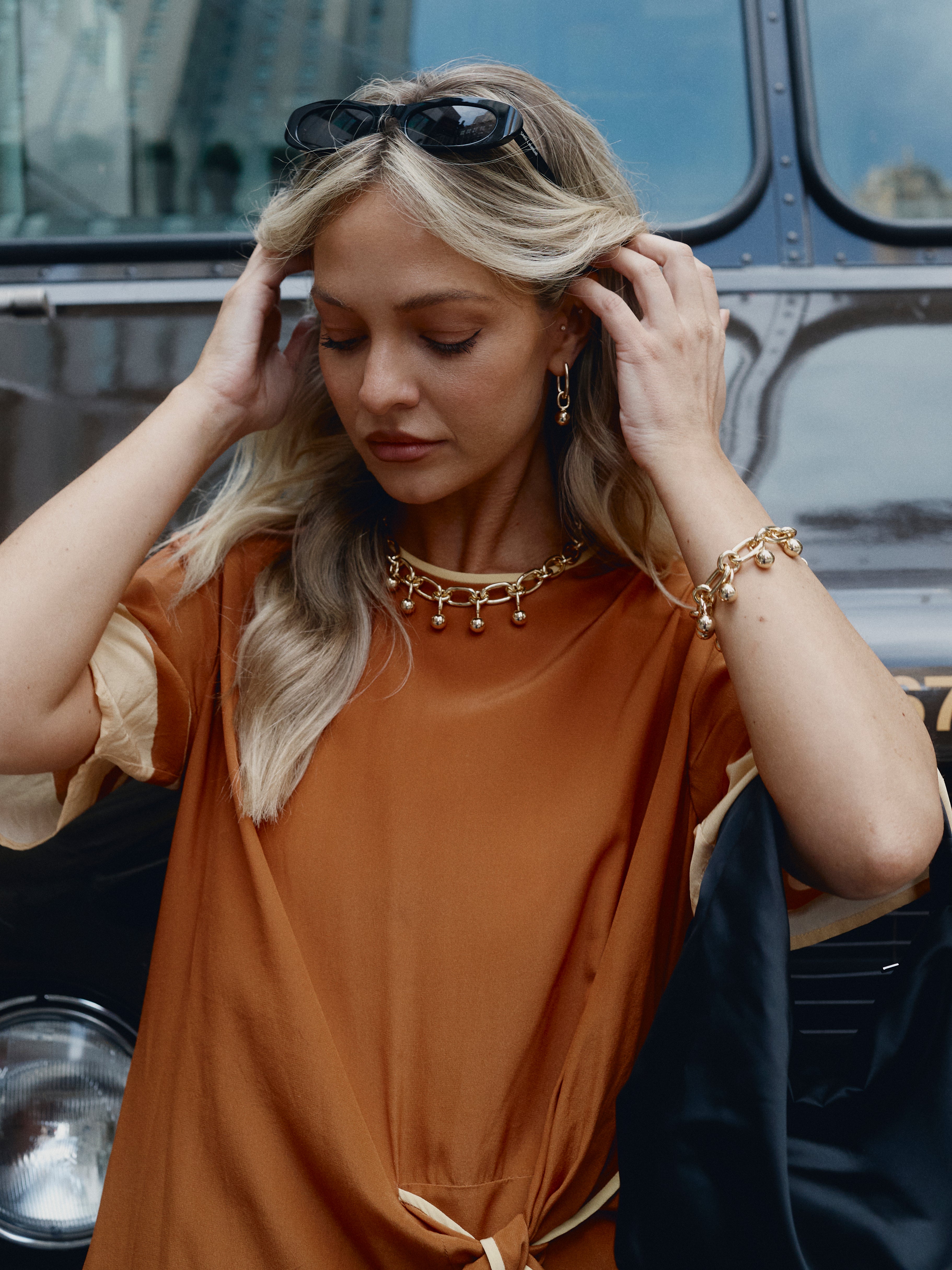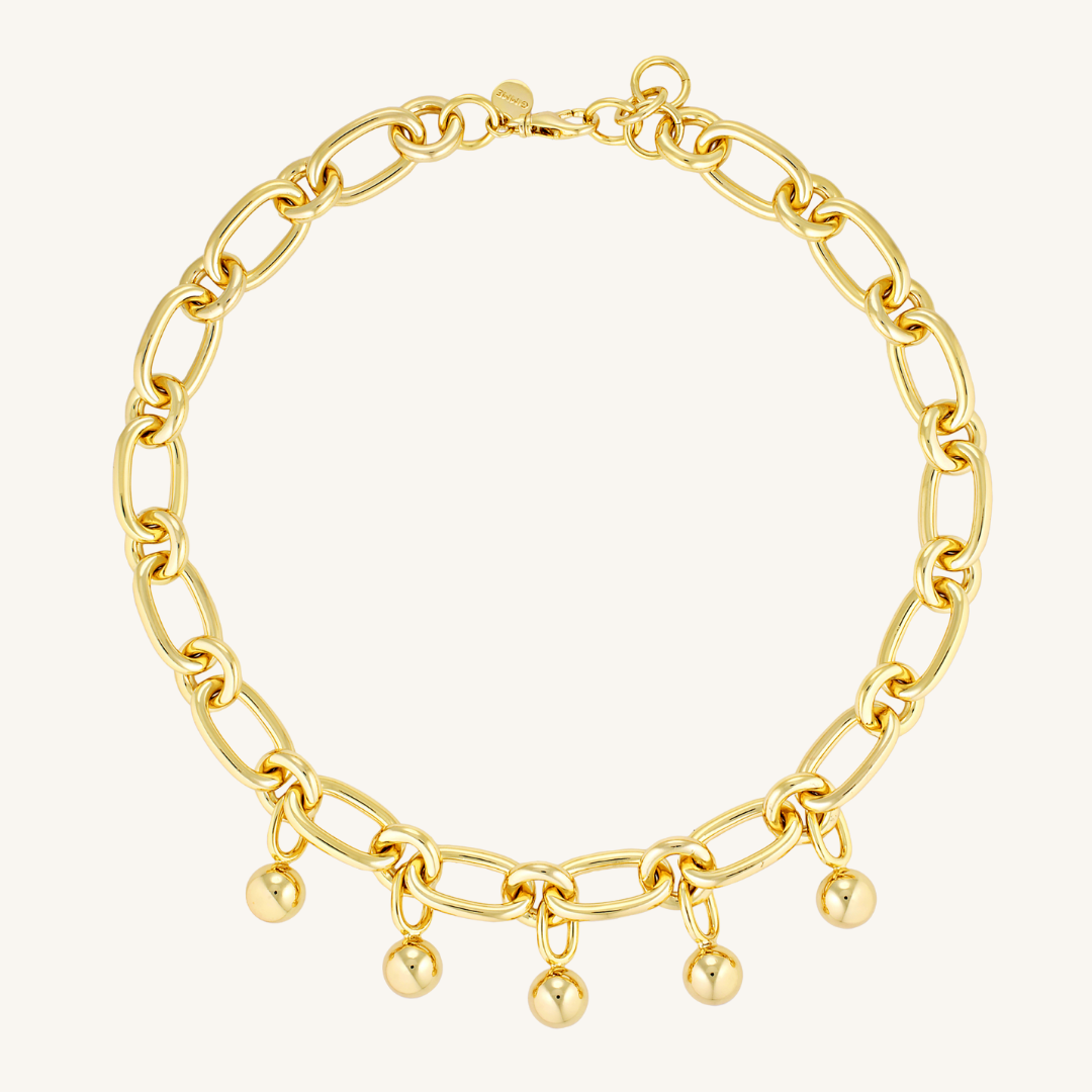 The Sphere Chain Necklace in gold brings sculptural edge with a luxe finish. Featuring oversized links and sphere charms, it drapes fluidly around the neckline for a look that moves from everyday polish to evening drama.