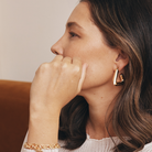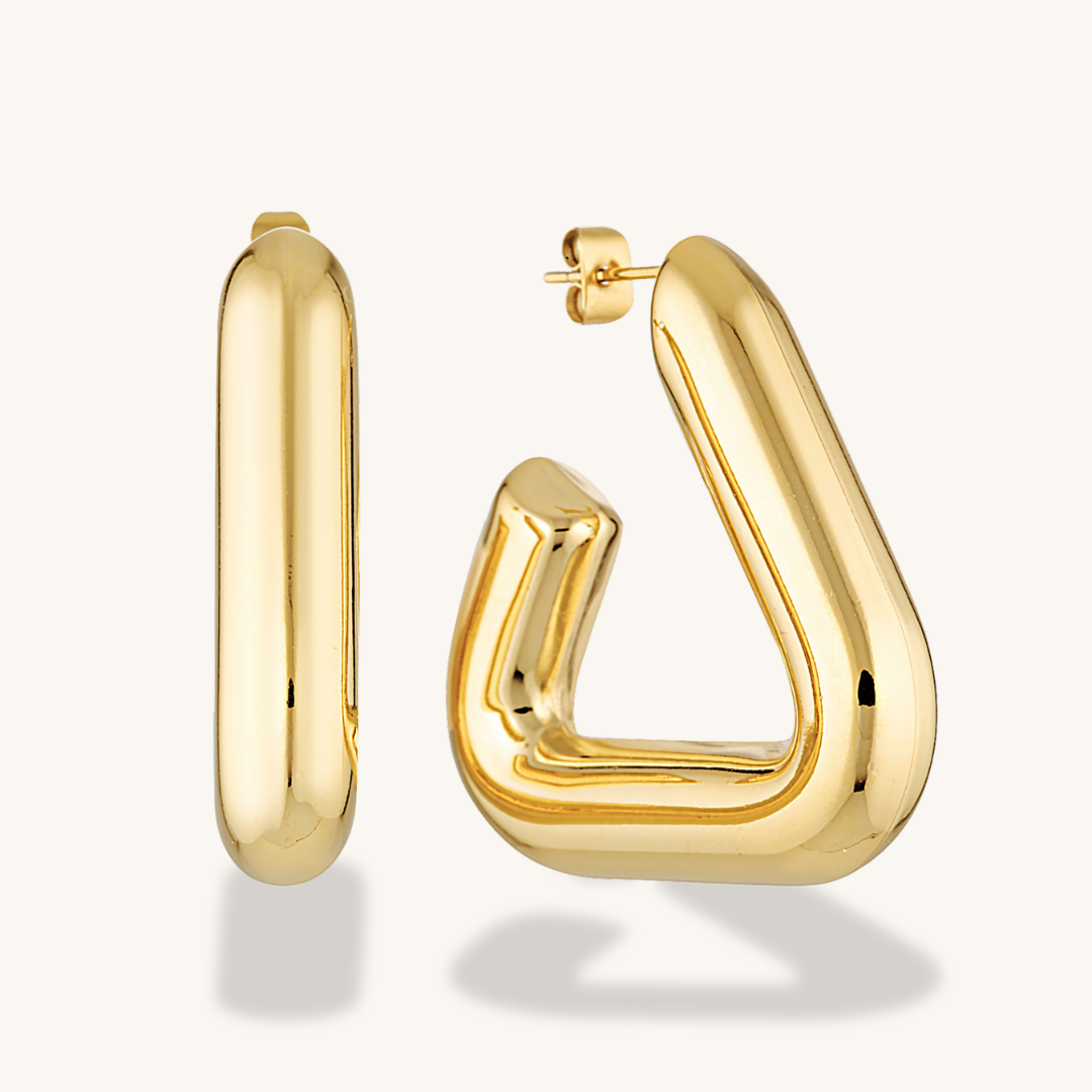 A shape made famous by 'It Girl' Selena Gomez, these triangular gold hoop earrings are bold and beautiful Crafted with gold-plated stainless steel, they are lightweight and easy to wear.