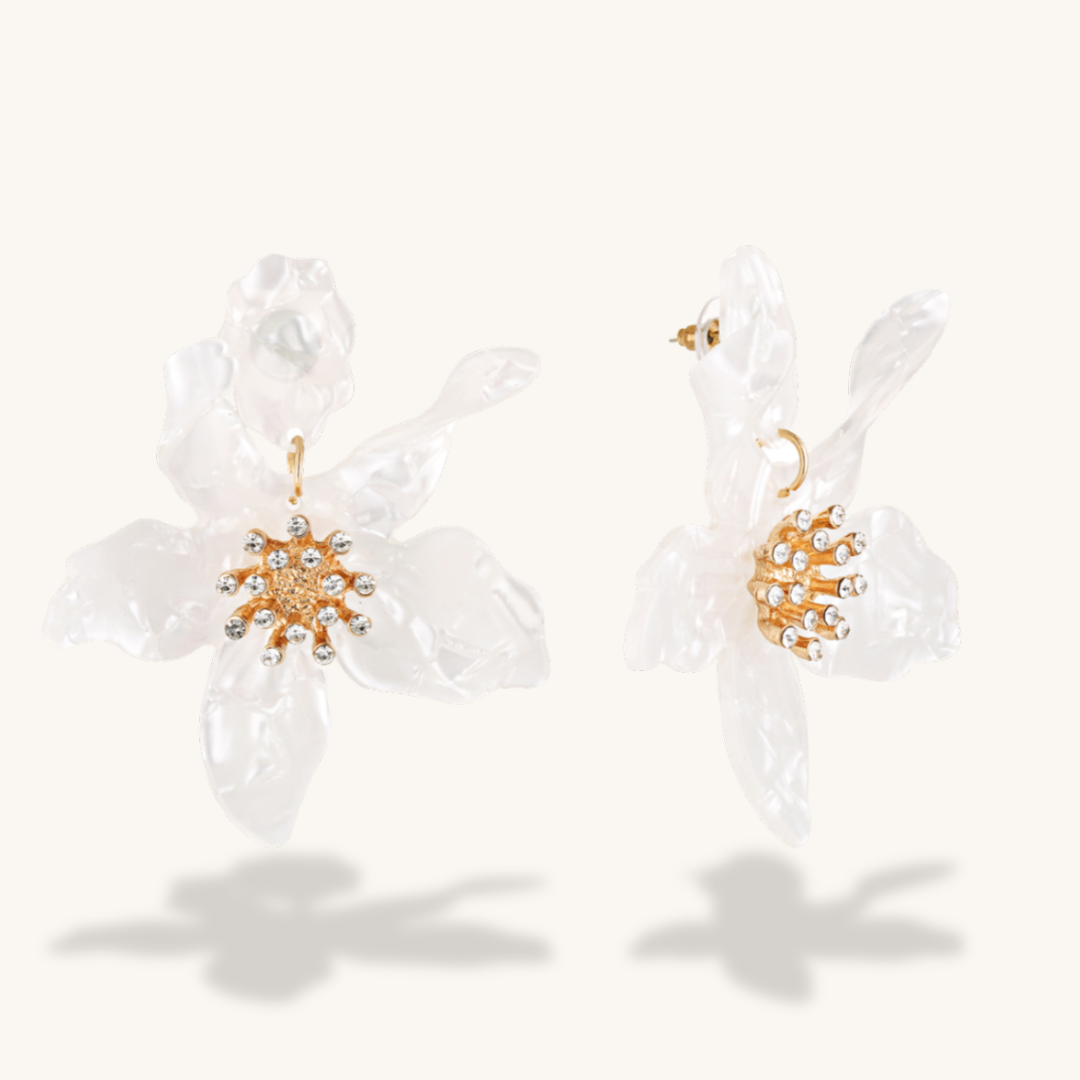 Turn heads with our ultra-feminine floral Fleur Earrings, now available in a stunning white colourway. Perfect for making a bold, yet effortlessly elegant statement. Ideal for the modern bride, bridesmaids and hens parties too!