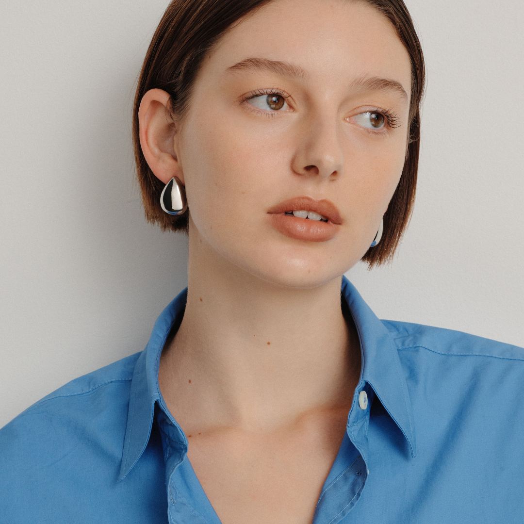 Meet your new go-to silver statement earrings. The teardrop shape is bold yet wearable, with a high-shine finish that catches the light and elevates your outfit in seconds. Consider these your everyday glow-up. Wear them with a slick bun and a simple tank, oversized shirt, or blazer for instant polish.